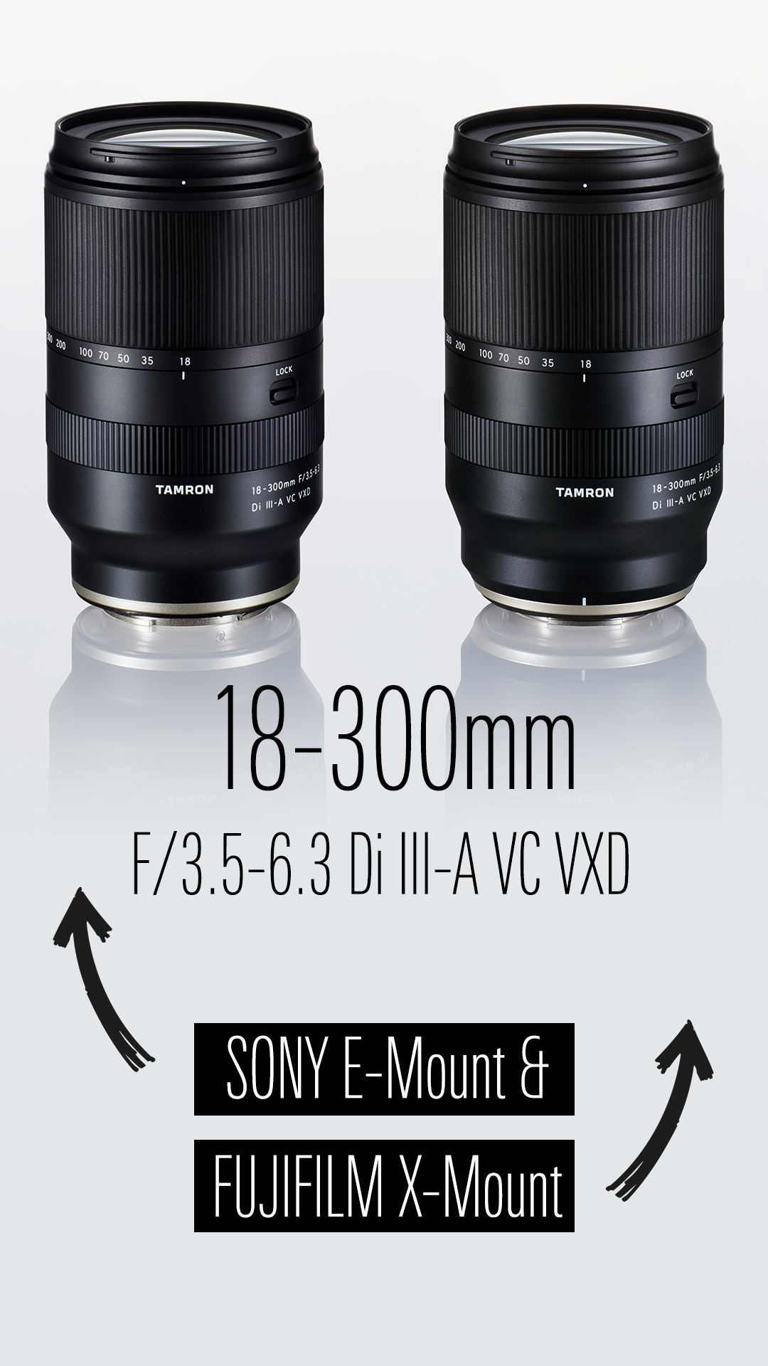 บริษัทผู้ผลิตเลนส์ชื่อดังอย่าง Tamron ประกาศเปิดตัวเลนส์รุ่นใหม่ล่าสุดกับ Tamron 18-300mm F3.5-6.3 Di III-A VC VXD สำหรับกล้อง Sony และ Fujifilm โดยเลนส์รุ่นใหม่นี้เป็นเลนส์อเนกประสงค์ที่รองรับการใช้งานกับกล้องเซ็นเซอร์ขนาด APS-C โดยมีระยะเทียบเท่า 27-450mm ในเซ็นเซอร์ Full Frame ให้อัตราซูม 16.6 เท่า สำหรับเลนส์ Tamron 18-300mm F3.5-6.3 Di III-A VC VXD นับเป็นเลนส์ตัวแรกที่ทาง Tamron ทำออกมารองรับการใช้งานกับกล้อง Fujifilm ด้วย