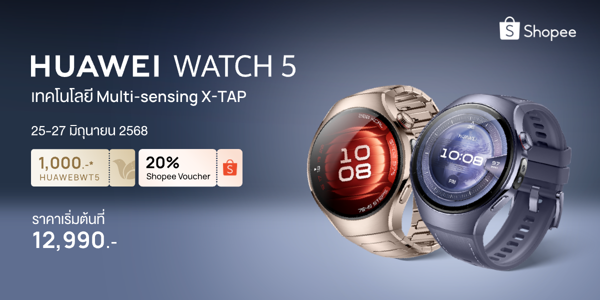 ใครมองหาสมาร์ทวอทช์ที่ครบทั้งดีไซน์และฟังก์ชัน ห้ามพลาด! HUAWEI WATCH 5 ระดับพรีเมียมที่ผสานดีไซน์หรู เข้ากับฟีเจอร์ล้ำสมัย ตอบโจทย์ทั้งสายสุ ขภาพและสายผจญภัยโดยแท้ แถมคุ้มยิ่งกว่าคุ้มในแคมเปญ Shopee Pay Day วันที่ 25 มิถุนายน 2568 - 27 มิถุนายน 2568 นี้