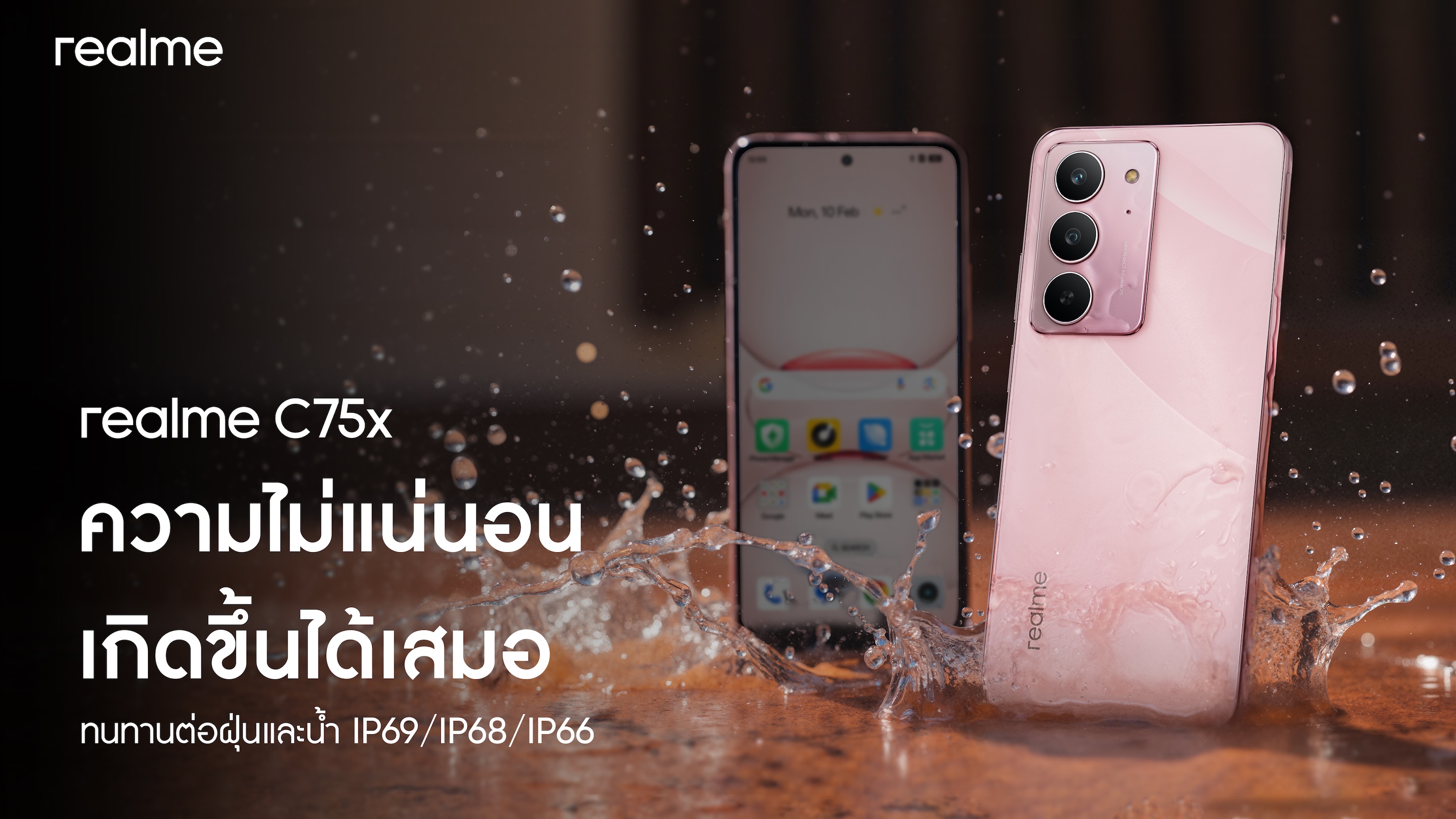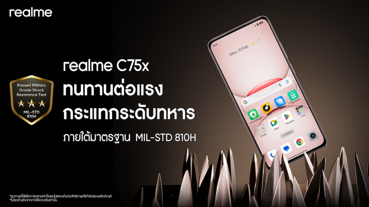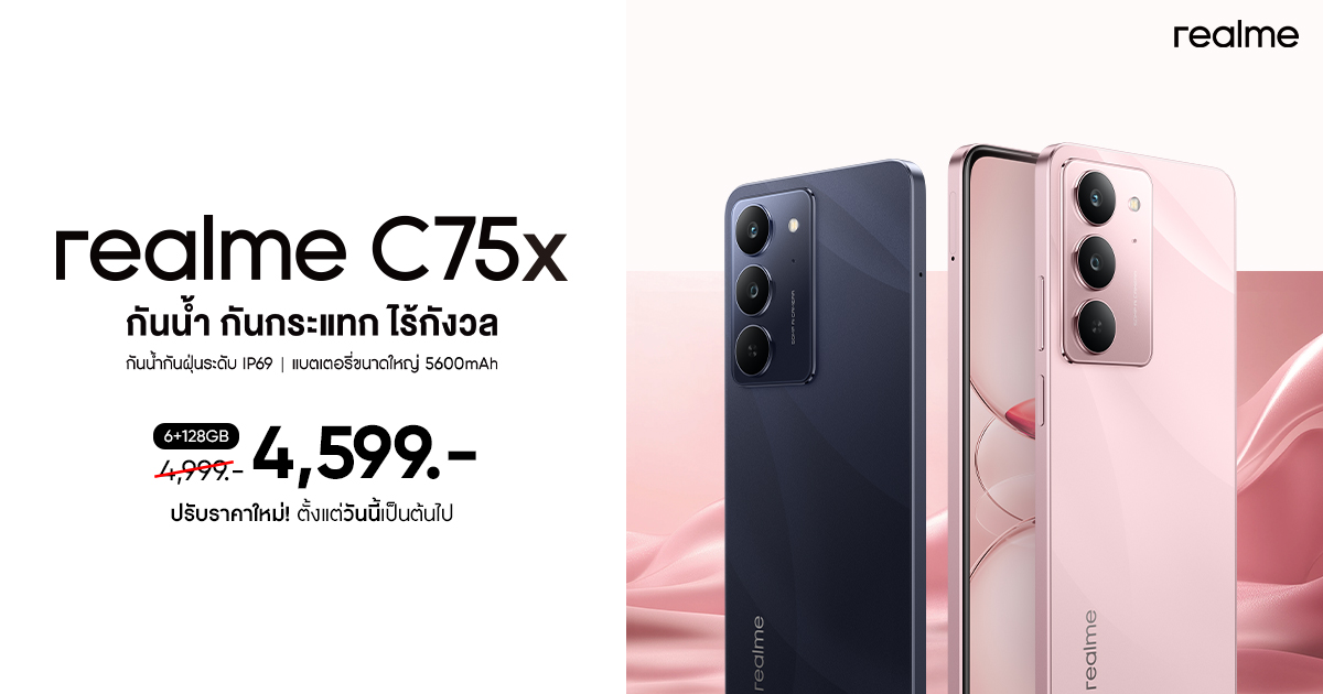 realme เอาใจแฟนมือถือสายบัดเจ็ตที่เน้นความทนทานและคุ้มค่า ประกาศปรับราคาสมาร์ตโฟนสุดแกร่ง “realme C75X” รุ่นความจุ 6GB+128GB จากเดิม 4,999 บาท เหลือเพียง 4,599 บาทเท่านั้น! พร้อมตอบโจทย์ผู้ใช้งานสายลุย ไม่ว่าจะเป็นไรเดอร์ส่งอาหาร คนค้าขายหรือผู้ที่ทำงานกลางแจ้ง พร้อมรับมือกับสภาพอากาศที่แปรปรวน โดยเฉพาะหน้าฝนที่กำลังมาถึงอย่างมั่นใจ ให้คุณไปจัดความคุ้มกันได้ตั้งแต่วันที่ 27 มิถุนายนนี้ ที่ realme Brand Shop ศูนย์จำหน่ายสมาร์ตโฟน และแพลตฟอร์มออนไลน์ชั้นนำของเมืองไทย