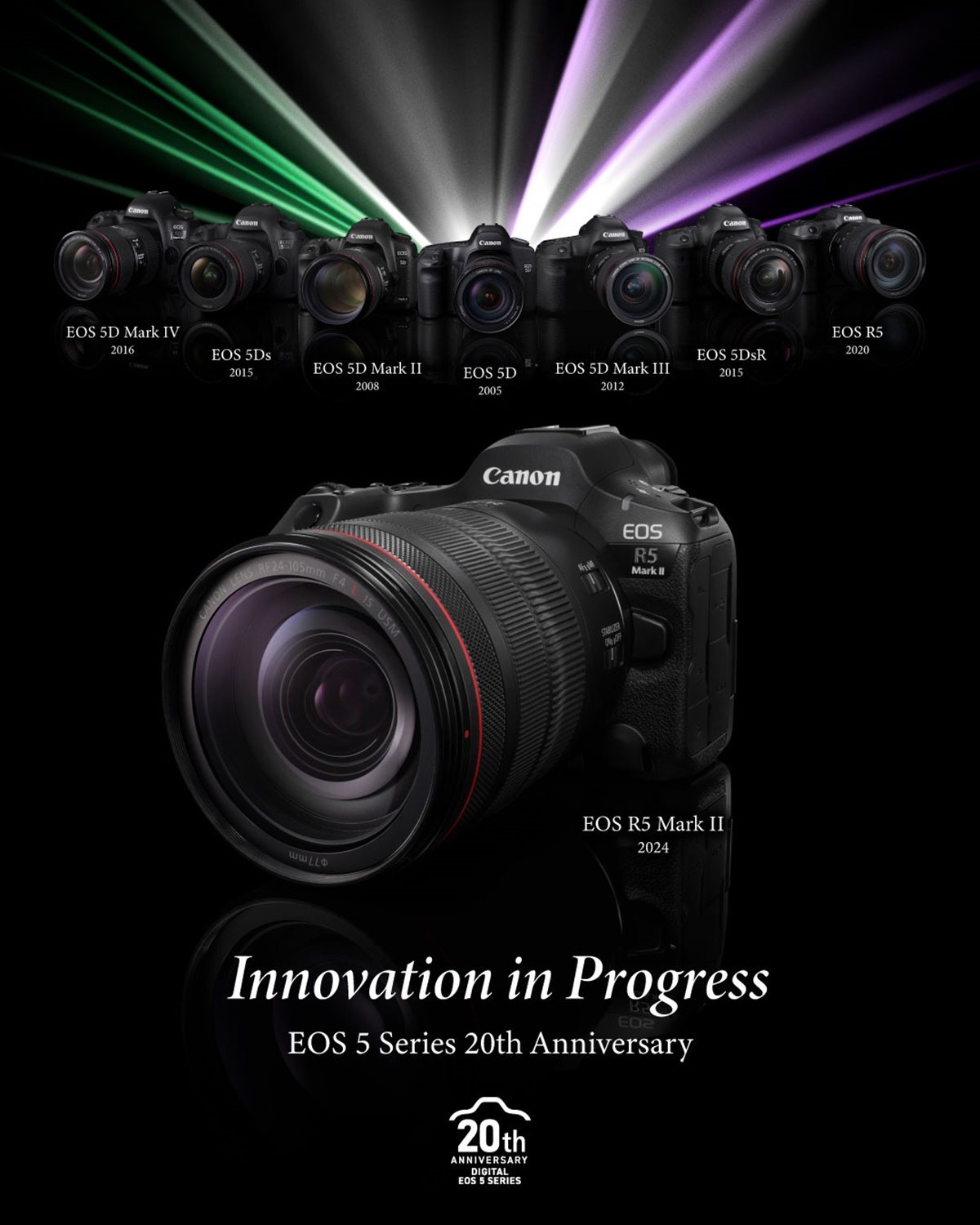นอกจากนี้ ในรุ่นต่อ ๆ มาอย่าง EOS R5 Mark II (เปิดตัวสิงหาคม 2567) ก็ได้รับการพัฒนาครั้งใหญ่ทั้ งในด้านภาพนิ่งและวิดีโอด้ วยระบบประมวลผลภาพแบบใหม่ “Accelerated Capture” และการใช้เทคโนโลยี Deep Learning เสริมประสิทธิภาพการติดตามวัตถุ และการเคลื่อนไหว มอบประสบการณ์การใช้งานที่คล่ องตัวและแม่นยำสูง ตอบโจทย์ทั้งผู้ใช้ระดับมืออาชี พและมือสมัครเล่นที่ต้องการสร้ างสรรค์ผลงานอย่างไร้ขีดจำกัด และทำให้ EOS 5 เป็นกลุ่มผลิตภัณฑ์ที่มี เทคโนโลยีล้ำสมัยและนวัตกรรมล้ำ หน้าเหนือกว่าผลิตภัณ์อื่น ๆ ในตระกูล EOS