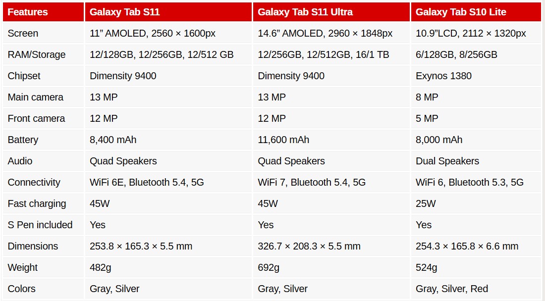 ด้านกล้อง Tab S11 Series จะมาพร้อมกล้องหน้า 12MP และกล้องหลัง 13MP ส่วน Tab S10 Lite จะมีกล้องหน้า 5MP และกล้องหลัง 8MP สำหรับความจุแบตเตอรี่ Tab S11 จะให้มา 8,400 mAh และ Tab S11 Ultra ให้มา 11,600 mAh ซึ่งทั้งคู่รองรับการชาร์จเร็ว 45W ส่วน Tab S10 Lite มีแบตเตอรี่ 8,000 mAh พร้อมรองรับชาร์จ 25W