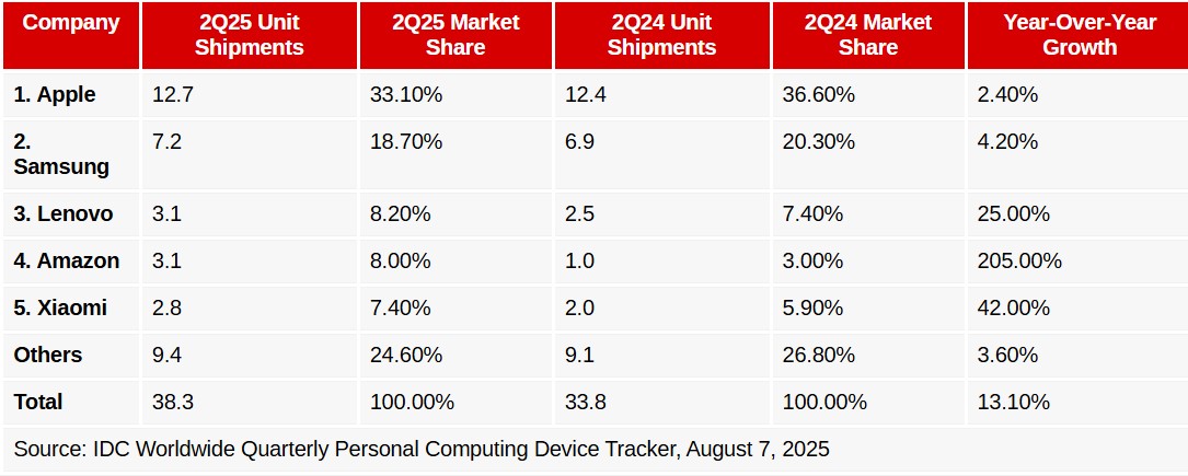 Apple ยังคงครองอันดับหนึ่งในตลาดแท็บเล็ตโลกด้วยยอดจัดส่ง 12.7 ล้านเครื่อง และส่วนแบ่งตลาด 33% โดยมี iPad (2025) รุ่นพื้นฐานเป็นตัวขับเคลื่อนสำคัญ ทำให้ Apple มีการเติบโตของยอดจัดส่งรวมเพิ่มขึ้น 2.4% เมื่อเทียบกับช่วงเดียวกันของปีที่แล้ว
