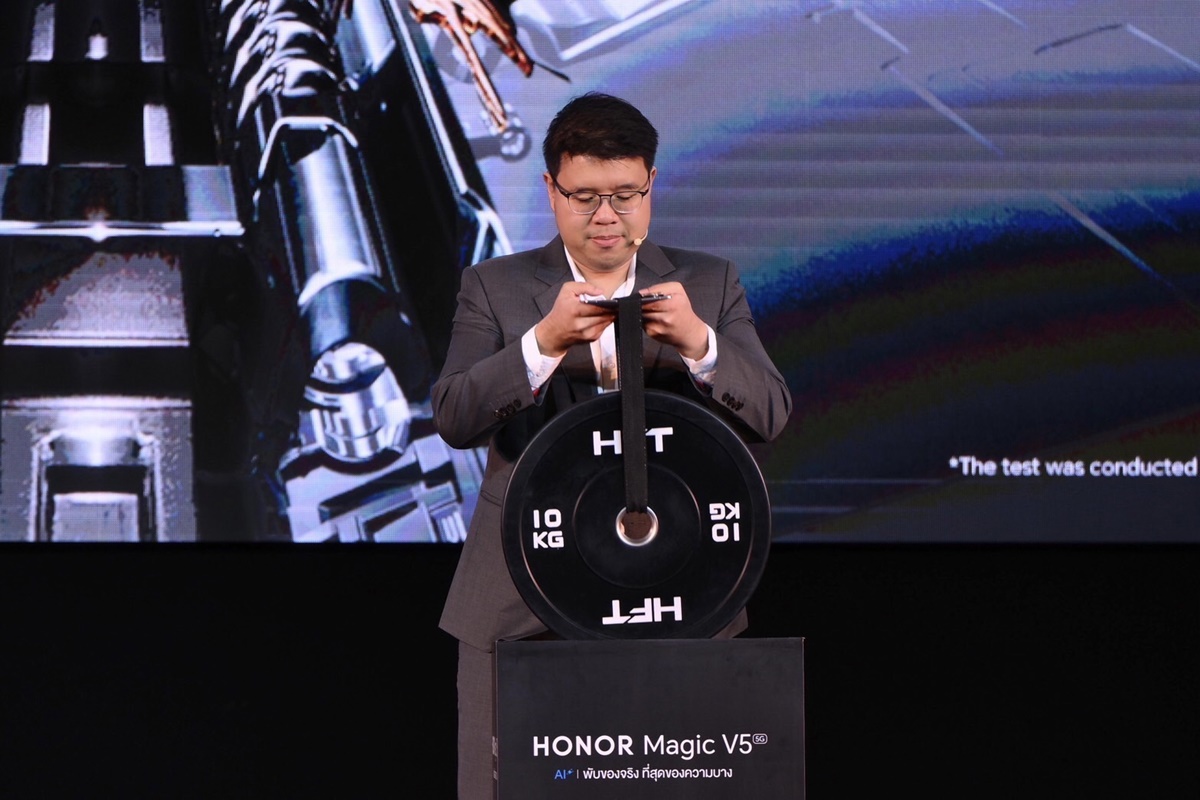 ด้าน นายพลภัทร์ สายบัวทอง ประธานเจ้าหน้าที่ฝ่ายปฏิบัติการ บริษัท ออเนอร์ ประเทศไทย กล่าวเสริมว่า “วันนี้ผมภูมิใจที่จะประกาศว่า เราทำสำเร็จแล้วกับการเปิดตัว HONOR Magic V5 อุปกรณ์ที่ไม่ใช่เพียงสมาร์ตโฟนจอพับ แต่คือนิยามใหม่ของอุตสาหกรรม ด้วยการเป็นสมาร์ตโฟนจอพับที่ทั้งบางและเบาที่สุด ซึ่งเกิดจากการผสานเทคโนโลยีหลัก 3 ประการเข้าด้วยกันอย่างลงตัว ได้แก่ เทคโนโลยีแบตเตอรี่ขั้นสูง ที่พัฒนาสถาปัตยกรรมใหม่ให้เล็กลงแต่ยังคงทรงพลัง การผลิตที่ขับเคลื่อนด้วย AI ช่วยเพิ่มความแม่นยำตั้งแต่การเลือกวัสดุจนถึงการประกอบและควบคุมคุณภาพ ทำให้แข็งแกร่งและเชื่อถือได้ วัสดุใหม่เพื่ออนาคต ที่ทั้งแข็งแรง ทนทานต่อการพับ และมีน้ำหนักเบา ทำให้พกพาสะดวกยิ่งกว่าเดิม”