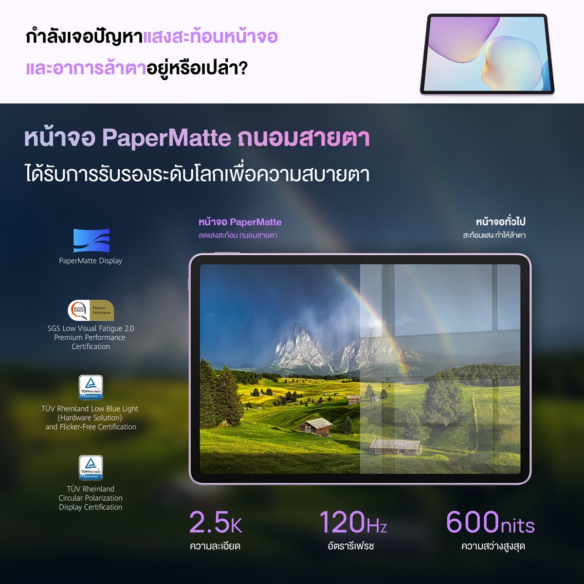 หนึ่งในจุดเด่นสำคัญของ HUAWEI MatePad 11.5” 2025 คือหน้าจอขนาด 11.5 นิ้ว ความละเอียด 2.5K HUAWEI FullView Display ที่มาพร้อมเทคโนโลยี PaperMatte ที่ช่วยลดแสงสะท้อนและแสงจ้าได้ถึง 99% เมื่อเทียบกับหน้าจอทั่วไป จึงสบายตาและลดความเมื่อยล้าสายตาแม้ใช้งานเป็นเวลานาน อีกทั้งยังแสดงผลได้คมชัดแม้ในสภาพแสงจ้า นอกจากนี้ยังมีผิวสัมผัสที่คล้ายกระดาษ ทำให้การอ่าน เขียน และวาดภาพบนหน้าจอให้ความรู้สึกเป็นธรรมชาติ เมื่อใช้คู่กับปากกา HUAWEI M-Pencil รุ่นที่ 3 จะมอบการใช้งานที่ลื่นไหล ส่วนอัตราการตอบสนองต่อลายมือที่ 240 Hz ยังให้ลายเส้นที่จรดลงบนหน้าจอมีความแม่นยำ