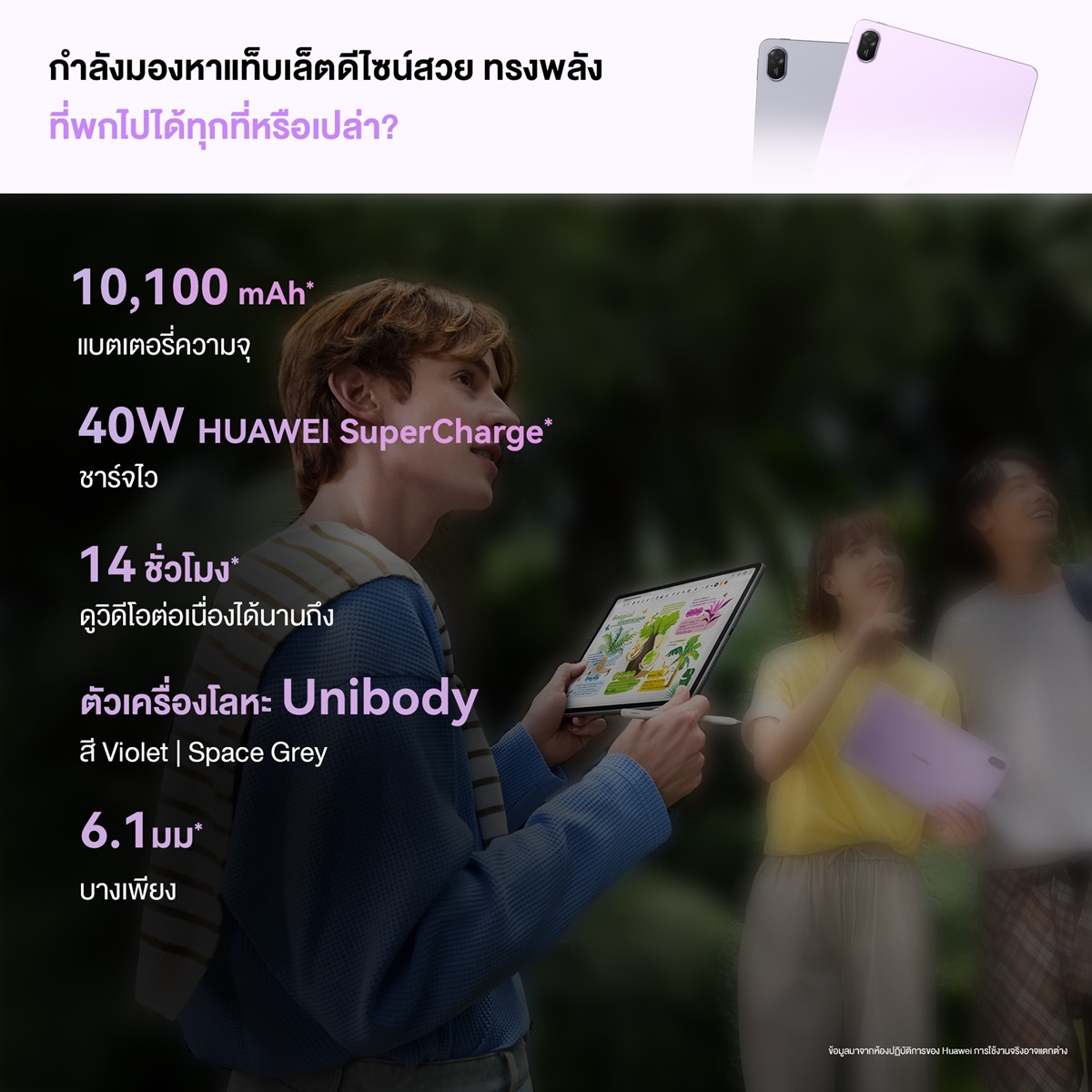 ตัวเครื่องบางเพียง 6.1 มม. และมีน้ำหนักเบาเพียง 515 กรัม ในดีไซน์ที่สวยทันสมัย พกพาสะดวก เหมาะสำหรับการใช้งานนอกสถานที่ ไม่ว่าจะพกไปเรียน ทำงาน หรือเดินทางท่องเที่ยว ก็ทำได้อย่างคล่องตัว นอกจากนี้ ยังอัดแน่นด้วยแบตเตอรี่ขนาดใหญ่ 10,100 mAh ที่ใช้งานได้ยาวนาน รองรับการเล่นวิดีโอต่อเนื่องกว่า 14 ชั่วโมง พร้อมเทคโนโลยีชาร์จไว 40W HUAWEI SuperCharge ที่ชาร์จแบตเตอรี่ได้เต็มในเวลาเพียง 94 นาที จึงไม่ต้องกังวลเรื่องแบตเตอรี่หมดระหว่างวัน