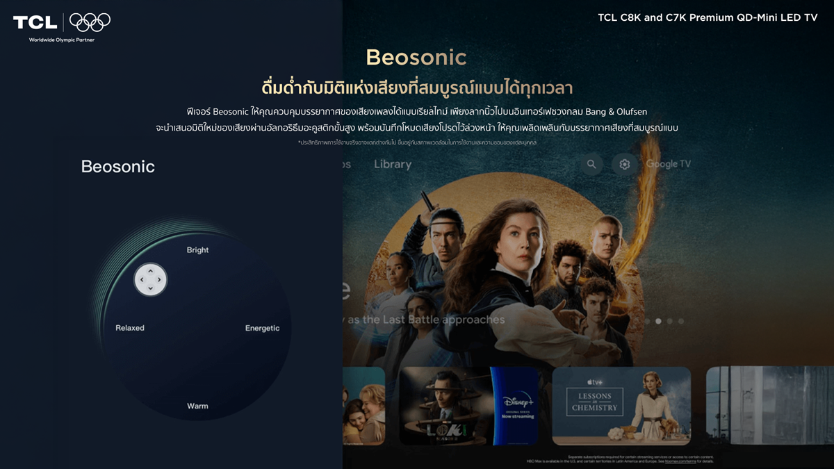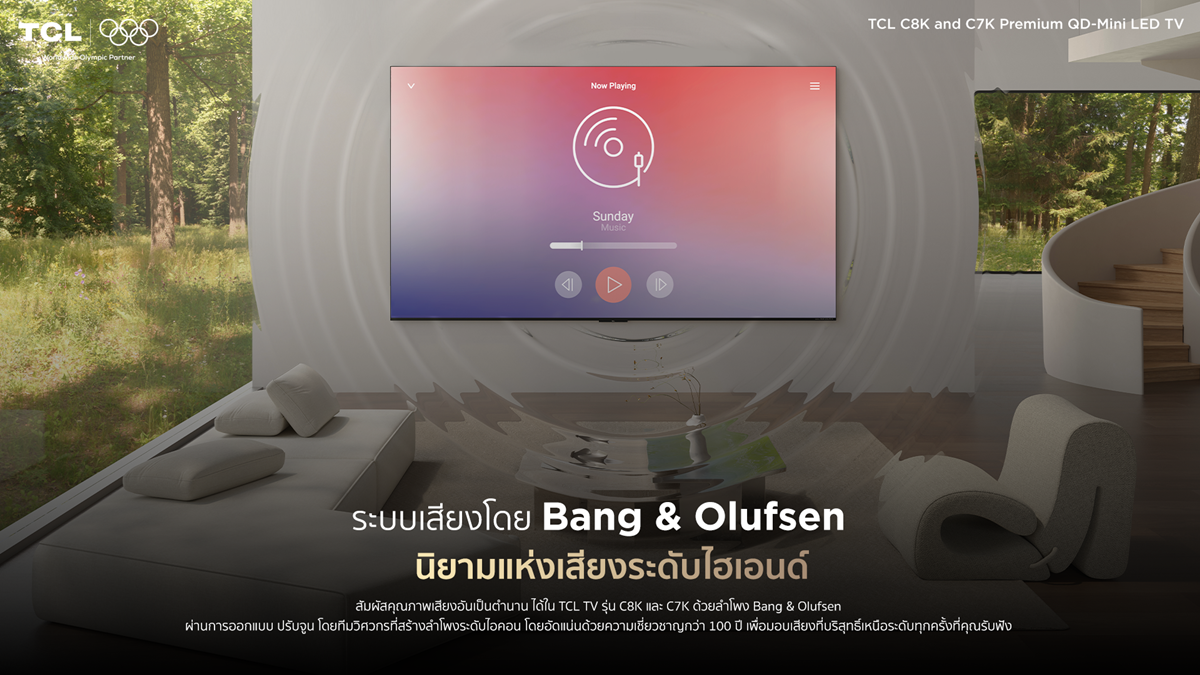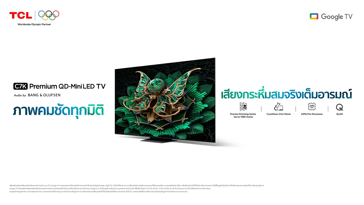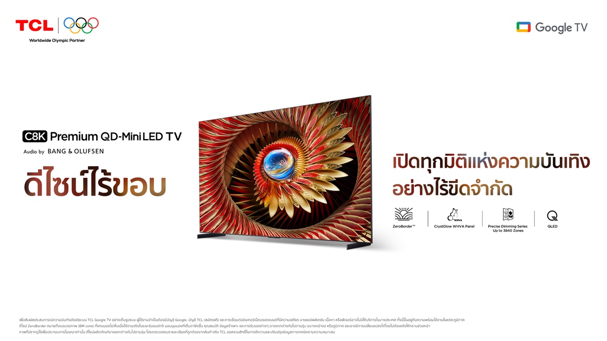 TCL ร่วมมือ Bang & Olufsen นิยามแห่งเสียงระดับ ไฮเอนด์ ระดับโลก ยกระดับความบันเทิงภายในบ้าน รังสรรค์ระบบเสียงที่เหนือชั้นเทียบชั้นโฮมเธียเตอร์ บนสมาร์ททีวี Ultra Premium QD-Mini LED TV ใน รุ่น C7K และ C8K พร้อมคุณภาพภาพที่สมจริงผสานจุดเด่นของ QLED และ Mini LED ความสว่างหน้าจอ สูงสุด 5,000 nits การันตีความเป็นที่สุดทีวีจอใหญ่ระดับพรีเมียม คว้ารางวัล EISA 2025–2026 ดีไซน์ไร้ขอบ ZeroBorder™ แผงหน้าจอผลิตจากวัสดุคอมโพสิตระดับไฮเอนด์ที่พัฒนาขึ้นโดย TCL โครงสร้างภายใน ที่ล้ำสมัยผ่านกระบวนการผลิต ความแม่นยำสูง ผสานพลัง AI เข้ากับการใช้งาน รองรับ Smart Home เปลี่ยนทุกห้องให้กลายเป็นศูนย์กลางไลฟ์สไตล์ดิจิทัล พร้อมฟีเจอร์สำหรับเกมเมอร์ สร้างประสบการณ์ Luxury Lifestyle