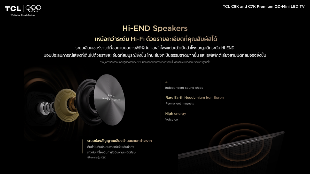ระบบเสียงโดย Bang & Olufsen นิยามแห่งเสียงระดับไฮเอนด์ จากเดนมาร์ก สัมผัสคุณภาพเสียงอันเป็นตำนาน ได้ใน TCL TV รุ่น C8K และ C7K ด้วยลำโพง Bang & Olufsen ผ่านการออกแบบ ปรับจูน โดยทีมวิศวกรที่สร้างลำโพงระดับไอคอน โดยอัดแน่นด้วยความเชี่ยวชาญกว่า 100 ปี เพื่อมอบเสียงที่บริสุทธิ์เหนือระดับทุกครั้งที่คุณรับฟัง ดังนั้น เมื่อเห็นคำว่า Audio by Bang & Olufsen จึงสะท้อนคำมั่นสัญญาบนระบบเสียงที่ใสบริสุทธิ์ และทุ่มนุ่มลึก ช่วยเพิ่มความดื่มด่ำในการรับชมและสัมผัสประสบการณ์ของเสียงทุกโน้ตที่ได้รับการปรับแต่งและทดสอบจนกว่าจะสะท้อนระดับชื่อเสียงของ Bang & Olufsen