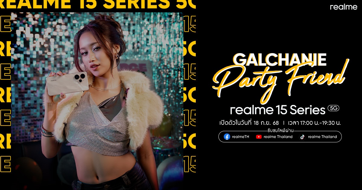 realme (เรียลมี) แบรนด์สมาร์ตโฟนเพื่อคนรุ่นใหม่ที่เติบโตเร็วที่สุดในโลก เตรียมสร้างปรากฏการณ์ความสนุกครั้งยิ่งใหญ่ในงานเปิดตัว “realme 15 Series 5G” สมาร์ตโฟนรุ่นล่าสุดจากตระกูล Number Series ที่มาพร้อม กล้อง Ultra-Clear Triple 50MP ยกระดับการถ่ายภาพคมชัดทุกรายละเอียด พร้อมอัดแน่นด้วยฟีเจอร์เด่นอย่าง AI Party Mode เติมเต็มไลฟ์สไตล์ทั้งสายถ่ายภาพ สายคอนเทนต์ และสายปาร์ตี้ตัวจริง งานนี้ยังได้ศิลปินสาวสุดฮอต GALCHANIE – “แกลชานี” ธนัญญา อินวงษ์ มาร่วมเป็นแขกรับเชิญพิเศษในบทบาท “realme Party Friend” ส่งต่อพลังบวกแห่งความสนุก แชร์มุมมองการใช้ชีวิตสไตล์ปาร์ตี้เกิร์ล และชวนแฟน ๆ สัมผัสประสบการณ์เอ็กซ์คลูซีฟไปด้วยกัน