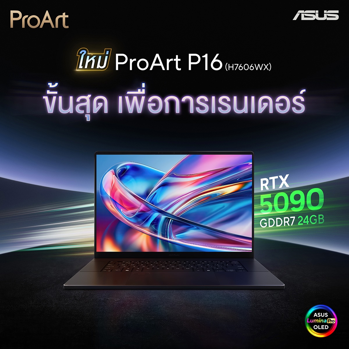 เอซุส (ประเทศไทย) เปิดตัว ProArt P16 โน้ตบุ๊กสำหรับสายครีเอเตอร์วี ดีโอระดับมืออาชีพ ออกแบบมาเพื่อให้พลังในการสร้ างสรรค์ทั้งในสตูดิโอและขณะเดิ นทาง รองรับเวิร์กโฟลว์ของครีเอเตอร์ ในหลากหลายสายงาน ไม่ว่าจะเป็นงานภาพยนตร์และตั ดต่อวิดีโอ, แอนิเมชันและออกแบบเกม, Vlogging, ช่างภาพ, กราฟิกดีไซเนอร์, นักออกแบบผลิตภัณฑ์(Product Design & Manufacturing) มาพร้อมโปรเซสเซอร์ AMD Ryzen™ AI 9 HX 370 ที่ให้ความสามารถในการประมวลผล AI ถึง 50 TOPS พร้อมด้วย NVIDIA® GeForce RTX™ 5090 Laptop GPU ให้ประสิทธิภาพด้าน AI อย่างเหนือชั้น รองรับการตัดต่อวีดีโอระดับโปร เล่นไฟล์ 4K/8K ได้อย่างลื่นไหล ส่งออกไฟล์ได้ไวขึ้น และเสถียรยิ่งขึ้นสำหรับไฟล์ที่ มีความละเอียดสูง