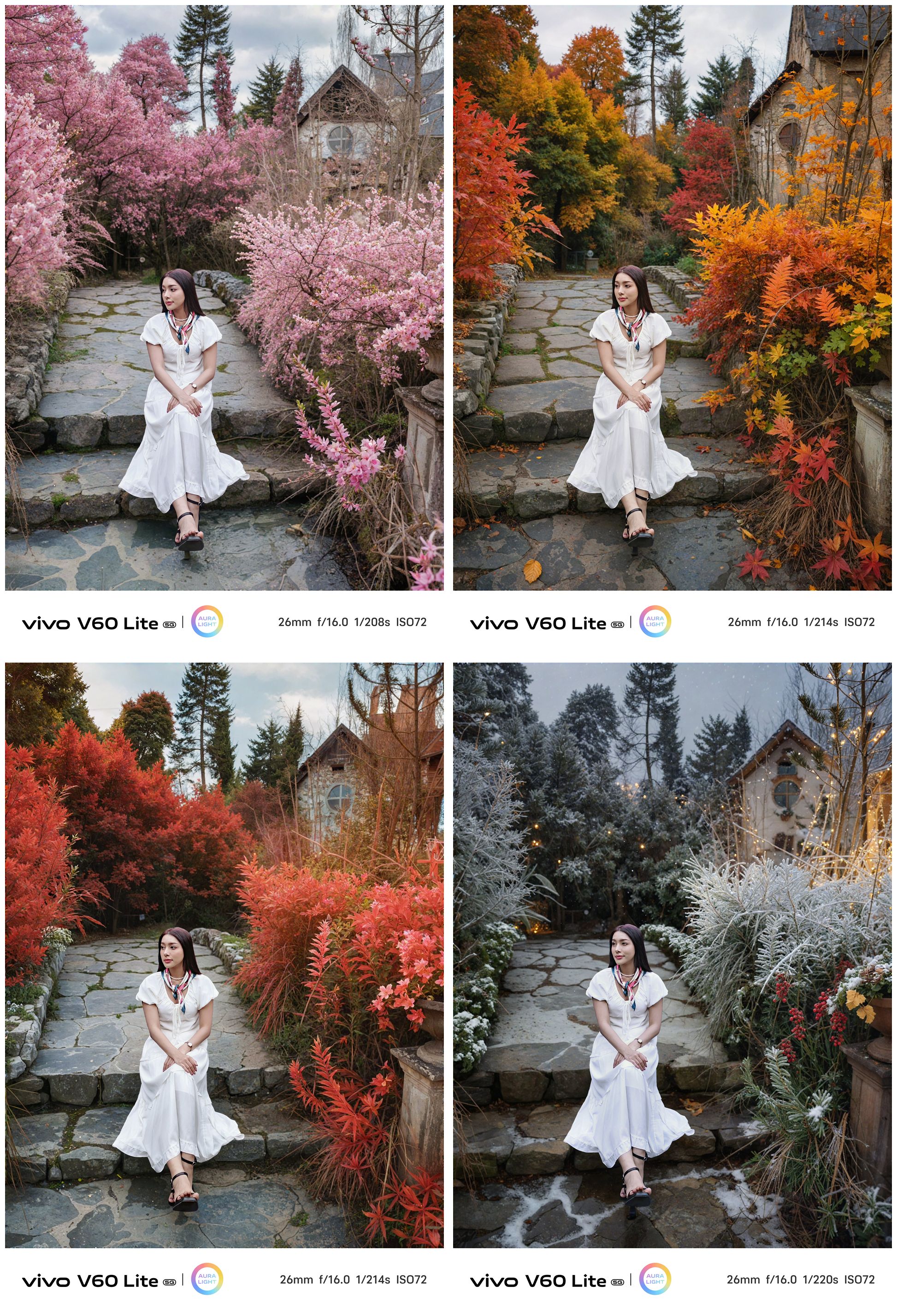 ถัดมาคือเรื่องของกล้องนั่นเอง แม้ว่า vivo V60 Lite จะไม่ได้ติดเลนส์ ZEISS ที่เป็นเอกลักษณ์ของ vivo มาให้ แต่ก็ยังคงใส่ฟีเจอร์และลูกเล่นต่างๆ มาให้ไม่ต่างกับรุ่นใหญ่เลย โดยเฉพาะการถ่ายภาพที่มีฟีเจอร์ AI Four Season Portrait สามารถตั้งค่าให้ได้ภาพถ่ายที่มีบรรยากาศเป็นฤดูต่างๆ ตั้งแต่ฤดูใบไม้ผลิ ฤดูร้อน ฤดูใบไม้ร่วง หรือฤดูหนาว โดย AI ใน vivo V60 Lite สามารถสร้างบรรยากาศได้อย่างสมจริงมากๆ