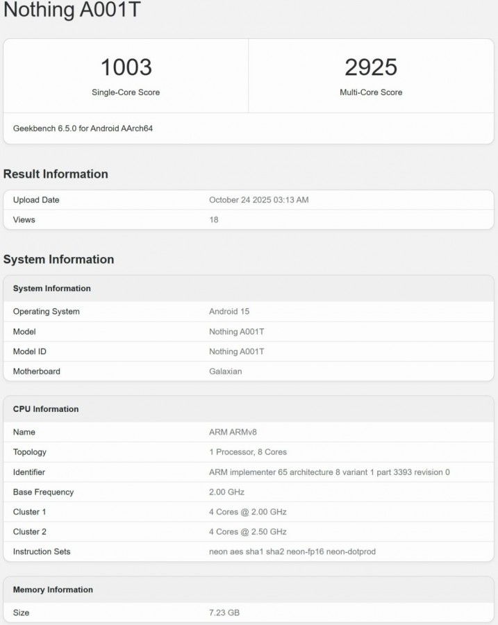 นอกจากกำหนดการและราคาที่หลุดออกมาแล้ว ยังมีอุปกรณ์ Nothing ที่คาดว่าเป็น Phone (3a) Lite ที่มีรหัสรุ่น A001T ไปปรากฏตัวบนเว็บไซต์ Geekbench โดยผลการทดสอบเผยว่าเครื่องต้นแบบดังกล่าวใช้ชิปเซ็ต Dimensity 7300 SoC, ทำงานบนระบบปฏิบัติการ Android 15 และมาพร้อม RAM 8GB ซึ่งทำคะแนนแบบ Single-core และ Multi-core ได้ที่ประมาณ 1,000 และ 2,900 คะแนนตามลำดับ ถึงแม้ว่าคะแนนเหล่านี้จะต่ำกว่าสมาร์ทโฟนที่ใช้ Dimensity 7300 รุ่นอื่นๆ ที่เคยมีการทดสอบ แต่ก็เป็นเรื่องปกติเนื่องจากเครื่องที่นำมาทดสอบมักเป็นเครื่องต้นแบบที่ยังรันซอฟต์แวร์เวอร์ชันก่อนวางจำหน่าย จึงคาดหวังได้ว่ารุ่นที่วางขายจริงที่มาพร้อมซอฟต์แวร์ที่เสถียรแล้วจะให้ประสิทธิภาพที่ดีกว่านี้อย่างแน่นอน