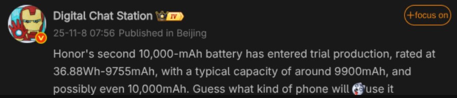 โดย Digital Chat Station (DCS) นักปล่อยข่าวลือชื่อดังยืนยันว่าโมเดลปริศนารุ่นที่สองนี้ได้เข้าสู่ขั้นตอนการผลิตทดลองในประเทศจีนแล้ว แบตเตอรี่ที่ทดสอบมีพิกัดที่ 36.88Wh (9,755mAh) และความจุทั่วไปประมาณ 9,900mAh ซึ่งใกล้เคียงที่จะแตะขีดจำกัด 10,000mAh อย่างแท้จริง การเกิดขึ้นของสมาร์ทโฟนแบตยักษ์เหล่านี้เป็นผลพวงมาจากความก้าวหน้าของ แบตเตอรี่ซิลิคอน-คาร์บอน ที่ทำให้สามารถบรรจุพลังงานได้มากขึ้นโดยที่ขนาดและน้ำหนักของเครื่องไม่เพิ่มขึ้นอย่างน่าตกใจ Honor จึงเดินหน้าใช้ประโยชน์จากเทคโนโลยีนี้อย่างเต็มที่.