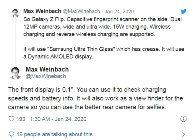ล่าสุดมีข้อมูลจาก Max Weinbach เปิดเผยข้อมูลเพิ่มเติมเกี่ยวกับ Samsung Z Flip ออกมาแล้วครับ โดยไปดูในส่วนของหน้าจอกันก่อน เขาระบุว่ารุ่นนี้จะมาพร้อมหน้าจอแบบ Ultra Thin Glass หรือ UTG ตามข่าวลือก่อนหน้านี้ โดยใช้หน้าจอแบบ Dynamic AMOLED สีสันสดใส และ CPU จะใช้เป็น Snapdragon 855+ ไม่ใช่ 855 ตามข่าวลือก่อนหน้า