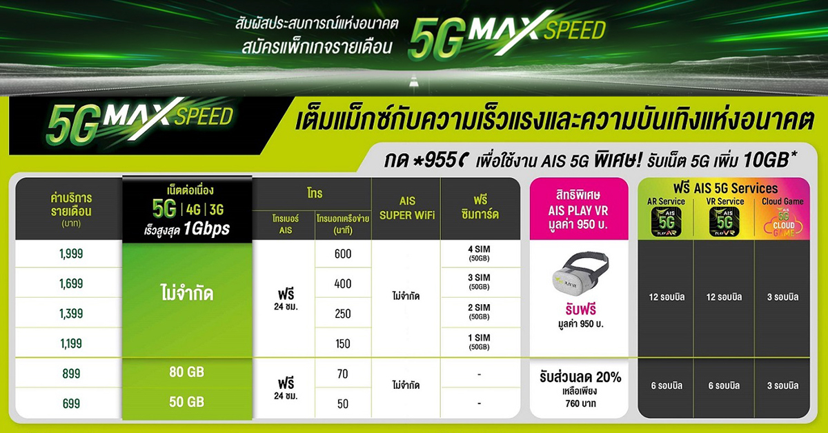 - แพ็กเกจรายเดือน 5G MAX SPEED แบบไม่จำกัด ค่าบริการเริ่มต้น 1,199 บาท เล่นเน็ต 5G เต็มสปีด ความเร็วสูงสุด 1 Gbps, โทรฟรีในเครือข่าย ตลอด 24 ชม., ซิมฟรีพร้อมเน็ต 5G อีก 50 GB, ใช้งานแอปพลิเคชัน AIS 5G PLAY VR และ AIS 5G PLAY AR ฟรีนาน 12 เดือน และเล่นเกมกับบริการ AIS 5G Cloud Game ฟรี 3 เดือน