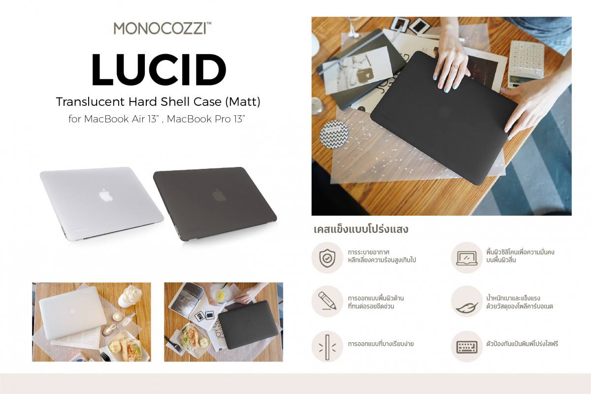 นอกจากนี้ ยังมีเคส MacBooks รุ่น LUCID Translucent Hard Shell Case (Matt) เป็นเคสที่ได้รับการออกแบบมาดีไซน์สวยทันสมัย ตัวเคสผลิตจากวัสดุที่เป็นโพลีคาร์บอเนต ที่มาพร้อมกับช่องช่วยระบายความร้อนได้เป็นอย่างดี อีกทั้งมีน้ำหนักเบา ทำให้สะดวกสบายต่อการพกพา ด้วยดีไซน์เคสที่เรียบง่ายแต่ให้ความทนทานสูง มาพร้อมฝาปิดแป้นพิมพ์แบบซิลิโคนกันของเหลว เพื่อให้การปกป้องที่รอบด้านแม้บนพื้นผิวที่ลื่น โดยเคส LUCID Translucent Hard Shell Case (Matt) สามารถรองรับ MacBook Air 13” และ MacBook Pro 13” พร้อม USB-C วางจำหน่ายแล้ววันนี้ในราคา 1,390 บาท