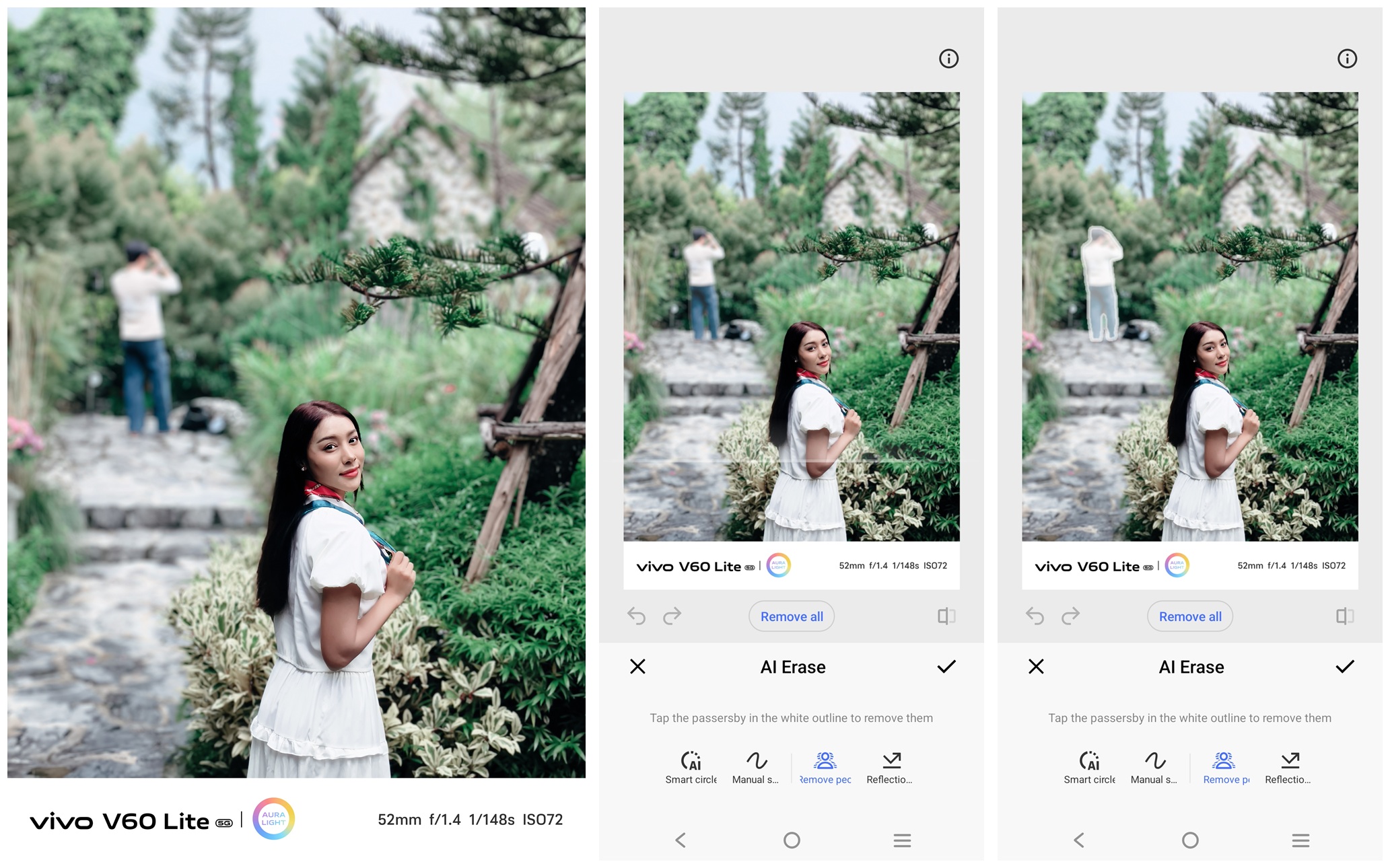 แน่นอนว่าในสมาร์ตโฟนรุ่นใหม่ๆ ก็ต้องมาพร้อมกับระบบ AI ซึ่งใน vivo V60 Lite เองก็มี AI หลายอย่างให้ใช้ อย่างเช่น การปรับแต่งภาพที่มีฟีเจอร์ที่ชื่อว่า AI Erase 3.0 สามารถลบบุคคลอื่นในภาพออกไปได้อย่างง่ายๆ ด้วยการแตะเพียงครั้งเดียว ช่วยให้ได้ภาพถ่ายสวยๆ เผื่อถ่ายติดคนอื่นเข้ามาอย่างไม่ตั้งใจ