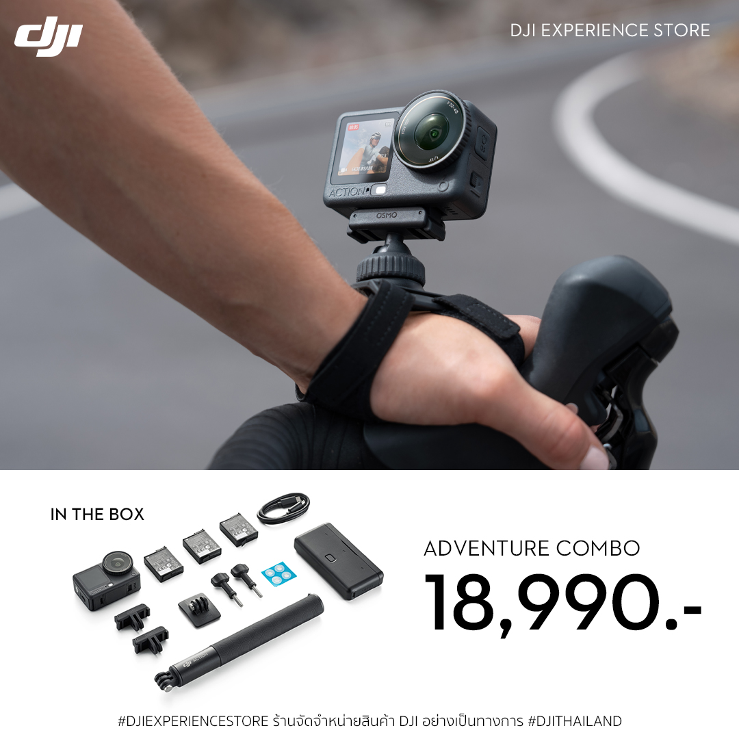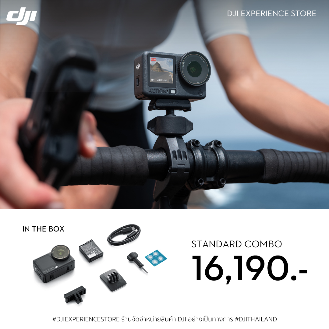 ● ประกอบด้วย Osmo Action 6, Osmo Action Extreme Battery Plus (1950 mAh), Osmo Dual-Direction Quick-Release Adapter Mount, Osmo Action Curved Adhesive Base, Osmo Locking Screw, USB-C to USB-C PD Cable, Osmo Action Anti-Slip Pad
