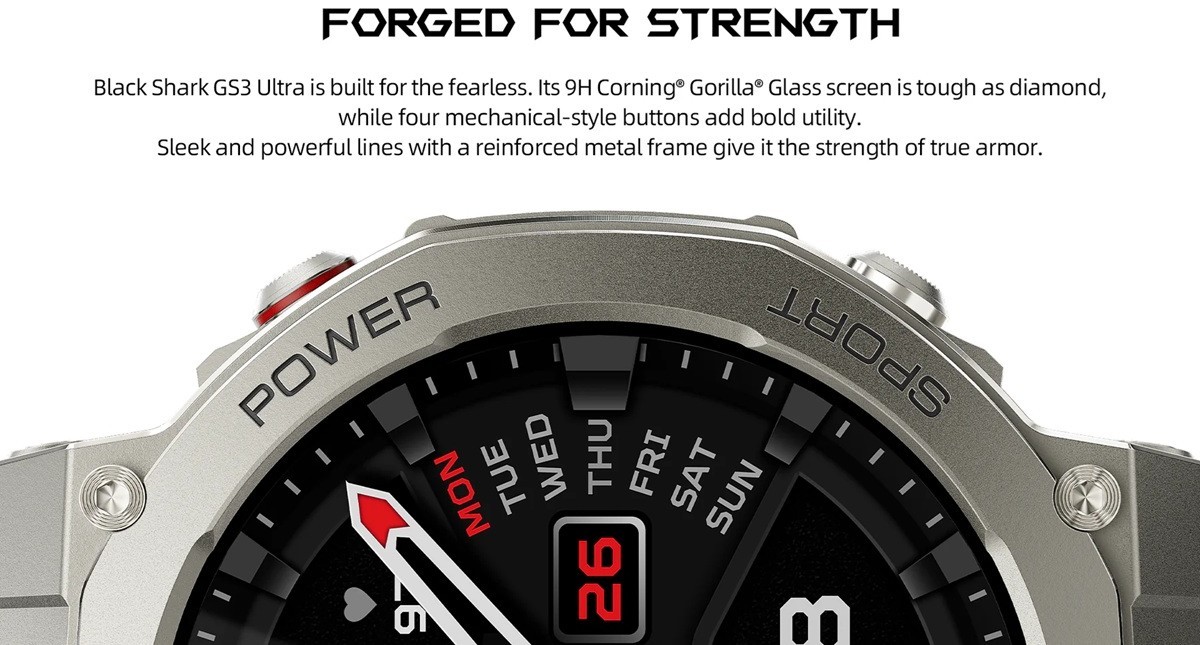 หนึ่งปีหลังจากเปิดตัว GS3 รุ่นดั้งเดิม Black Shark ได้กลับมาพร้อมกับสมาร์ทวอทช์สุดแกร่งรุ่นใหม่ล่าสุดคือ Black Shark GS3 Ultra นาฬิกาเรือนนี้มาพร้อมกับ "กรอบโลหะเสริมความแข็งแรง" และปุ่มควบคุมสไตล์กลไกถึงสี่ปุ่ม หน้าจอเป็นแบบ AMOLED ทรงกลมขนาด 1.43 นิ้ว ความละเอียด 466x466 พิกเซล ซึ่งสว่างถึง 1,000 nits และได้รับการปกป้องด้วยกระจก 9H Gorilla Glass ตัวเครื่องได้รับการรับรองมาตรฐานความทนทานทางทหาร MIL-STD-810 และมีคุณสมบัติกันน้ำที่ระดับ 5ATM รวมถึงมาตรฐานการป้องกันน้ำและฝุ่นระดับสูงสุด IP69K ซึ่งทนทานต่อแรงดันน้ำร้อนสูงได้ด้วย.
